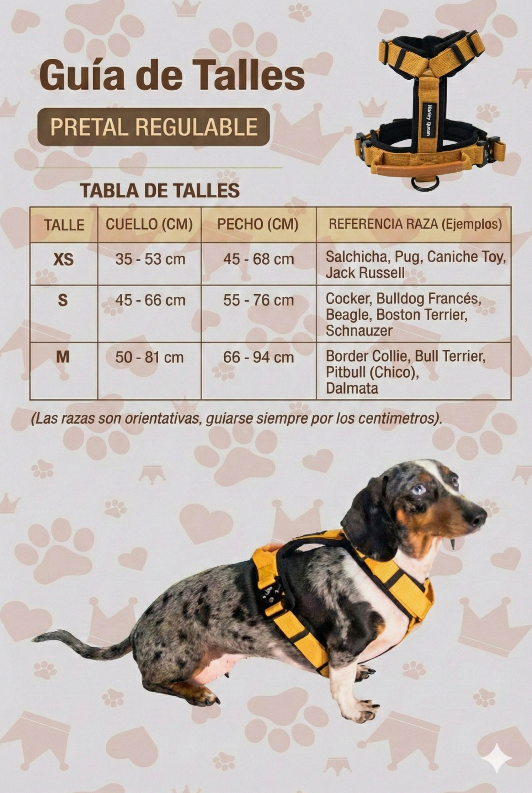 (Tip: Dejá el espacio de dos dedos entre la cinta y el cuerpo de tu perrito para asegurarte de que no le quede muy ajustado. Por ejemplo, para una salchicha como Harley Mila Queen, el talle XS resulta el calce ideal).